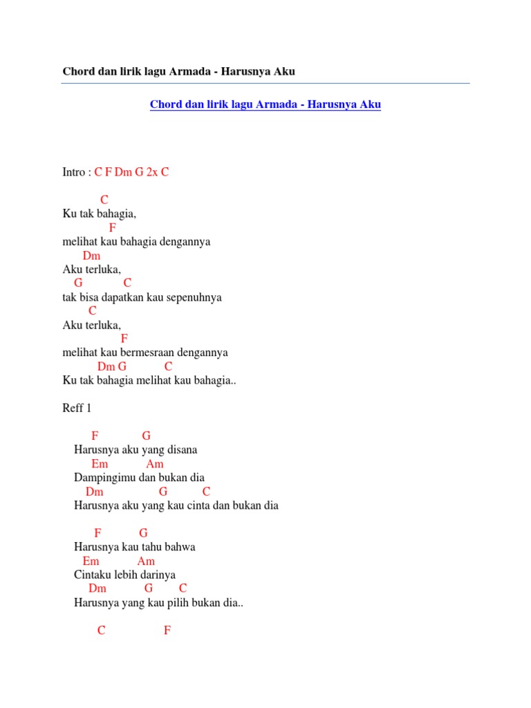 Chord Gitar Lirik dan Chord Gitar Harusnya Aku - Armada. C F Dm G 2x C C Ku tak bahagia F melihat kau bahagia dengannya Dm Aku terluka G C tak bisa dapatkan kau. Last edit on Feb 13 2014.
