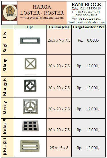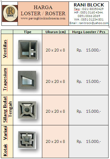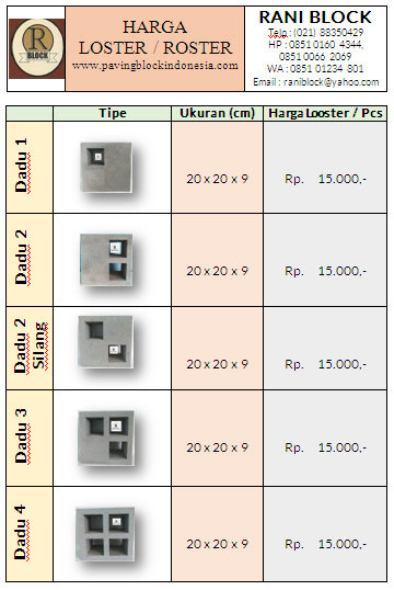 PRICELIST HARGA ECER LOSTER BATAKO ANGIN2 SEMEN CETAKAN ROOSTER di Tokopedia Promo Pengguna Baru Cicilan 0 Kurir Instan. Paving Block Batako Buis Beton Kanstin Loster Ventilasi Udara PAVING Specialis di Solo Sragen Karanganyar Sukoharjo Solo Baru Paving Bata holand Paving Cacing Paving Segi Enam Paving Kawung Paving Grass Block Rumput Paving Diamond Belah Ketupat - PAVING BLOCK Menyediakan berbagai macam Paving Block dengan kualitas yang baik dan harga yang terjangkau. Rani Block menjual Loster atau Roster dengan harga loster terjangkau.
